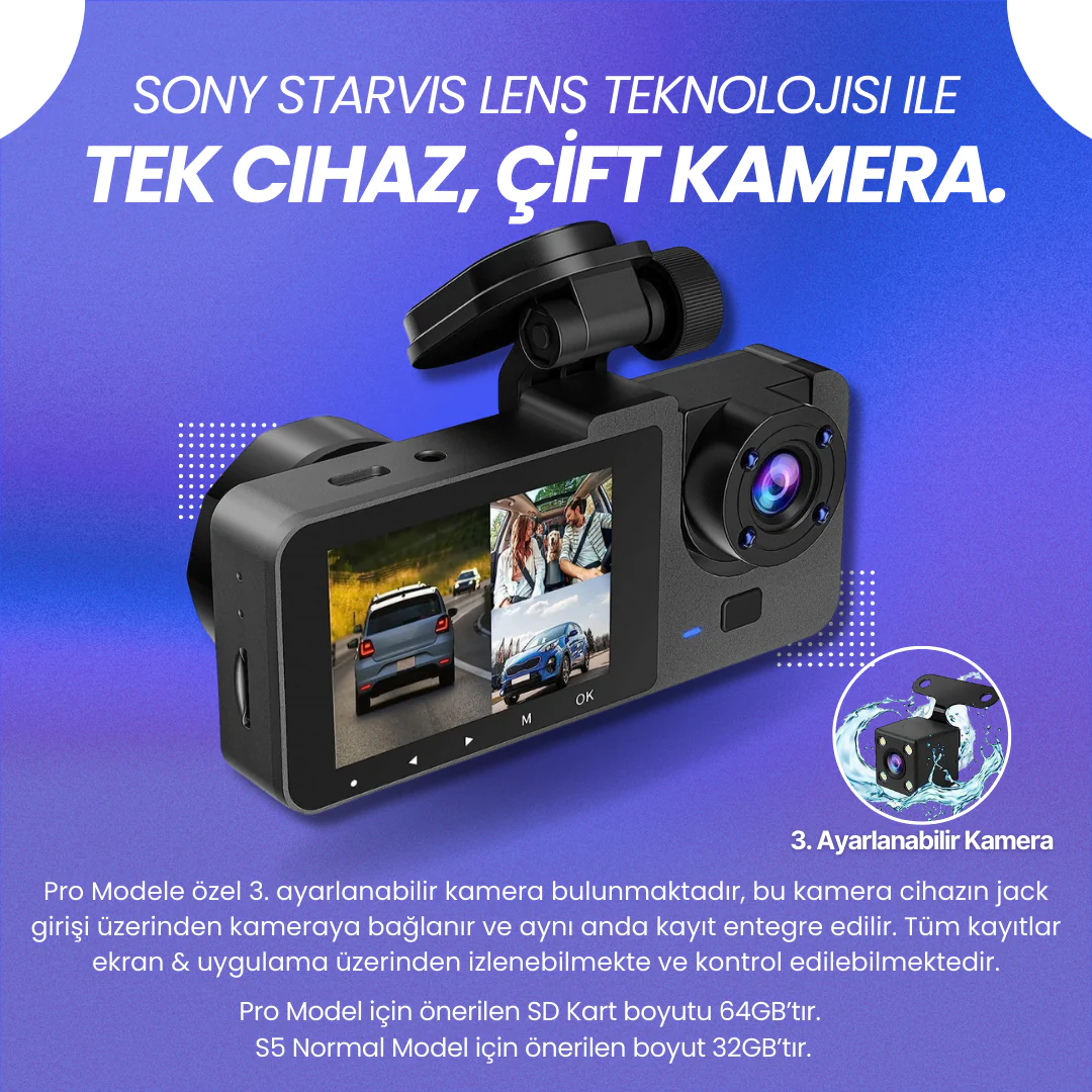 Trafik kazasında yeterli delilin yoksa haklıyken haksız duruma düşebilirsin. Rexing S5 sürüş ve park halinde aracın önünü, kokpitini ve arkasını Sony Starvis Lensi ile geniş açıyla kayıt eder.