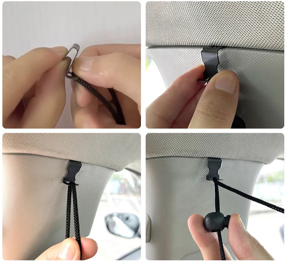 Metal Kancayı Arabanın İç Kısmındaki Direğe Asın Ve Ardından İpi Gerdirin İşte CarCurtain Güneşliğiniz Hazır.
